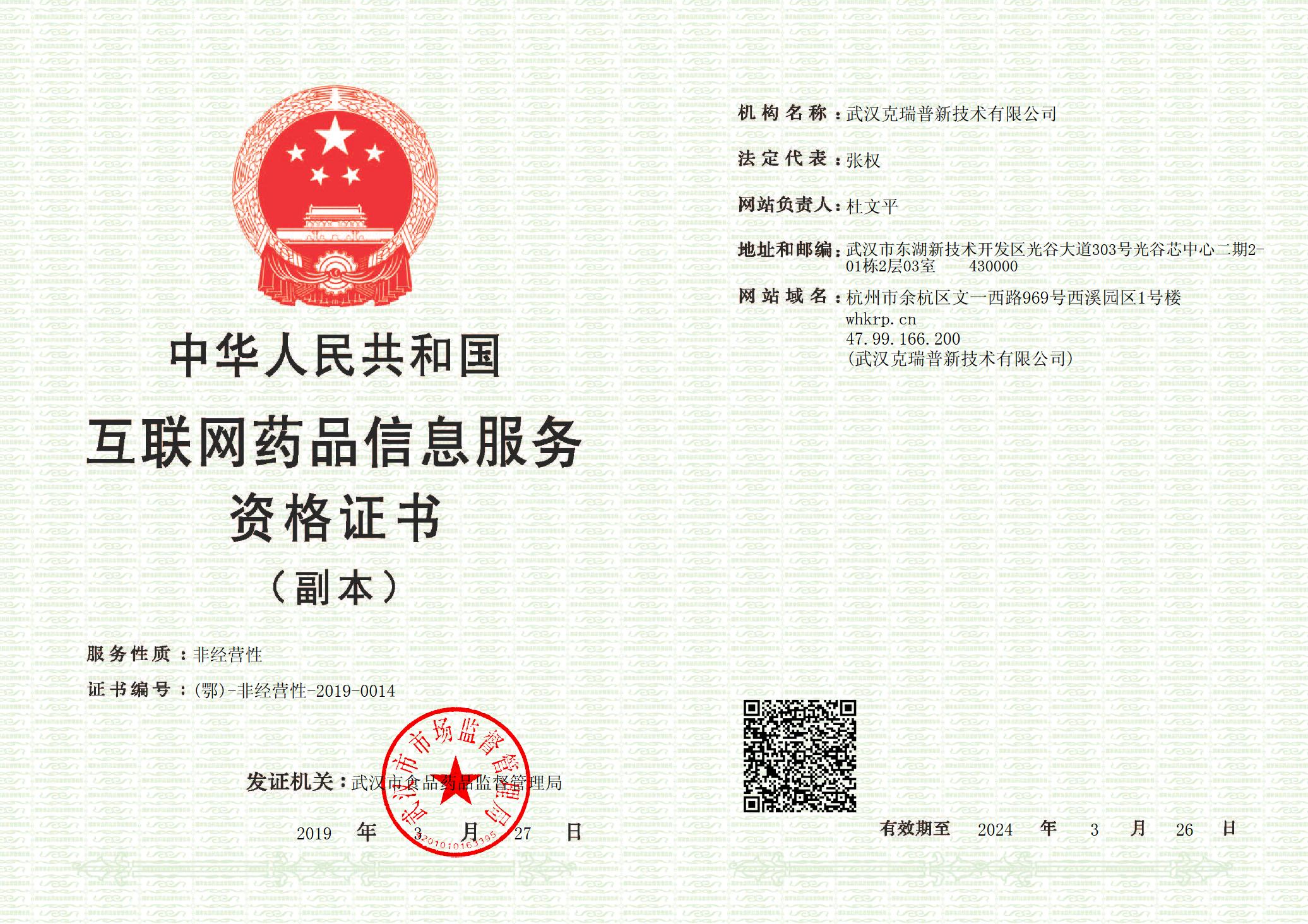 互聯(lián)網(wǎng)藥品信息服務(wù)資格證書 證書編號:(鄂)-非經(jīng)營性-2019-0014