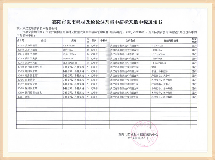 【湖北省襄陽市醫(yī)用耗材及檢驗(yàn)試劑集中招標(biāo)采購中標(biāo)通知書】武漢克瑞普新技術(shù)有限公司在參加襄陽市醫(yī)療機(jī)構(gòu)醫(yī)用耗材集中招標(biāo)采購項(xiàng)目中經(jīng)評定我們公司已成功中標(biāo),我們的中標(biāo)產(chǎn)品有高分子繃帶、高分子夾板、醫(yī)用外固定支具等多種骨科耗材產(chǎn)品,我們的骨科耗材系列產(chǎn)品都有國家出具的證書全套的資質(zhì)齊全,可適用于胸外科、骨科、急診科、理療科、整形科、120急救等。