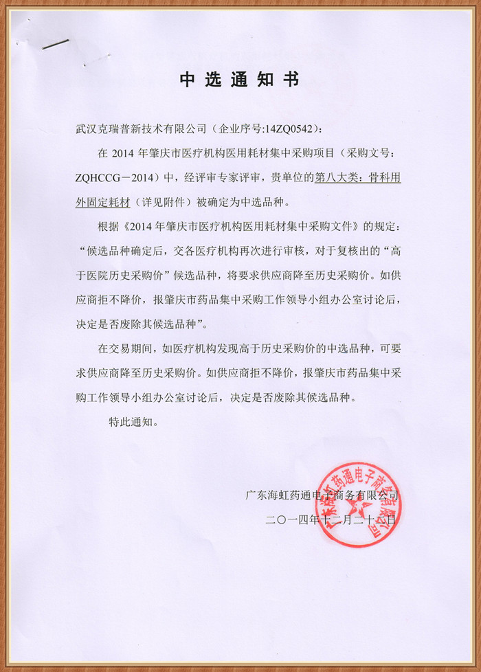 【廣東省2014年肇慶市醫(yī)療機(jī)構(gòu)醫(yī)用耗材集中采購項(xiàng)目中標(biāo)通知書】武漢克瑞普新技術(shù)有限公司(采購文號:ZQHCCG-2014)中我們公司生產(chǎn)的骨科用外固定耗材產(chǎn)品已成功中標(biāo),我們的骨科耗材產(chǎn)品種類較多,全部為一類的骨科耗材產(chǎn)品歡迎各大經(jīng)銷商與我們?nèi)〉寐?lián)系。
