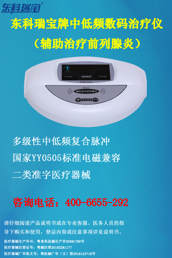 該款東科瑞寶前列腺儀器采用多級性中低頻復(fù)合脈沖電流原理,根據(jù)前列腺特性,由電腦程序控制中頻脈沖電流3000Hz-至低頻脈沖電流370Hz之間變頻轉(zhuǎn)換,利用專用理療電極片等配件耗材輸出,并通過特定穴位釋放輔助治療前列腺炎等疾病。