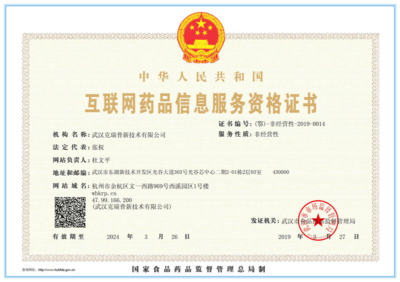 武漢克瑞普新技術(shù)有限公司于2019年3月27日取得了湖北省武漢市食品藥品監(jiān)督管理局(武漢市市場(chǎng)監(jiān)督管理局)頒發(fā)的《互聯(lián)網(wǎng)藥品信息服務(wù)資格證書》,公司網(wǎng)站 whkrp.cn,該證書編號(hào):(鄂)-非經(jīng)營(yíng)性-2019-0014,互聯(lián)網(wǎng)藥品信息服務(wù)資格證書***期為2019年3月27日至2024年3月26日止。