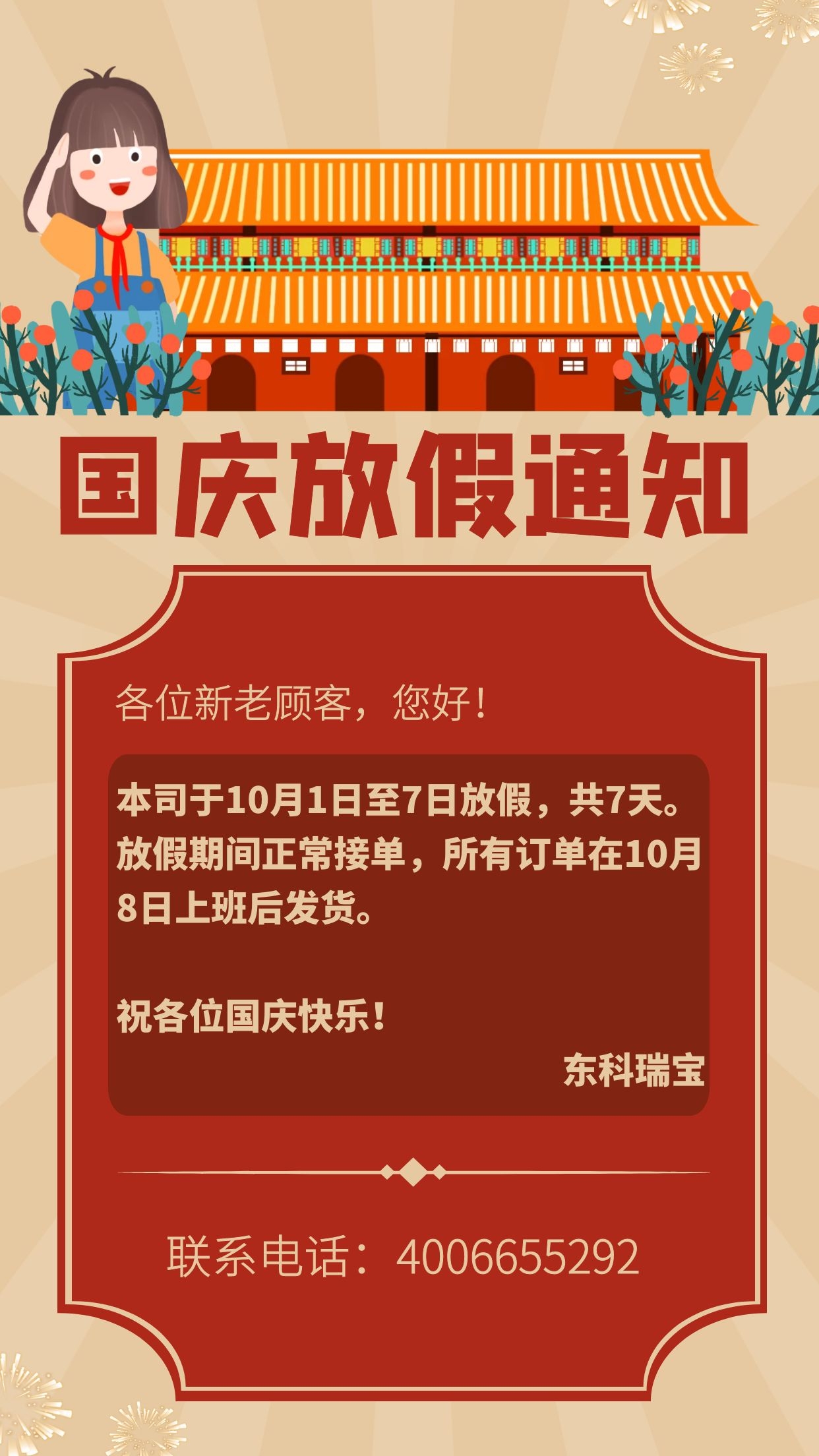 各位新老客戶,您好! 本司于10月1日至7日放假,共7天。放假期間正常接單,所有訂單在10月8日上班后發(fā)貨。 祝各位國(guó)慶快樂(lè)! 東科瑞寶 ????