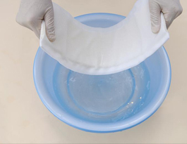 2、打開包裝袋,把東科圣康高分子夾板浸入常溫20℃-25℃水中約4-8秒鐘,同時用手擠壓無紡棉,反復2-3次;