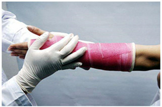 6、固定部位有皮外傷或需操作更長時間時,夾板可先不浸水,直接用紗布繃帶或彈性繃帶纏繞固定后在薄外層的無紡布上噴灑水來加速硬化;