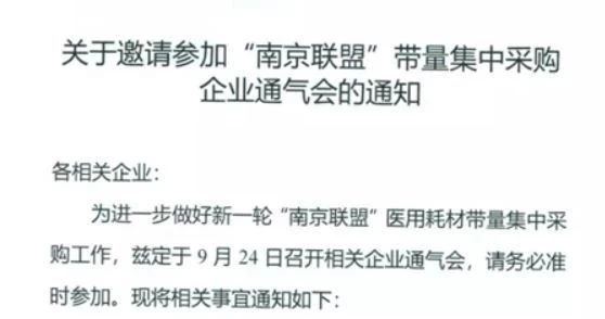 近日,一份《關(guān)于邀請參加“南京聯(lián)盟”帶量集中采購企業(yè)通氣會的通知》在業(yè)內(nèi)流傳,顯示為進一步做好新一輪南京聯(lián)盟醫(yī)用耗材帶量集中采購工作,茲定于9月24日召開企業(yè)通氣會。