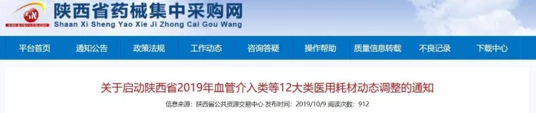 10月9日,陜西省藥械集中采購網(wǎng)發(fā)布《關(guān)于啟動陜西省2019年血管介入類等12大類醫(yī)用耗材動態(tài)調(diào)整的通知》(下稱《通知》)。